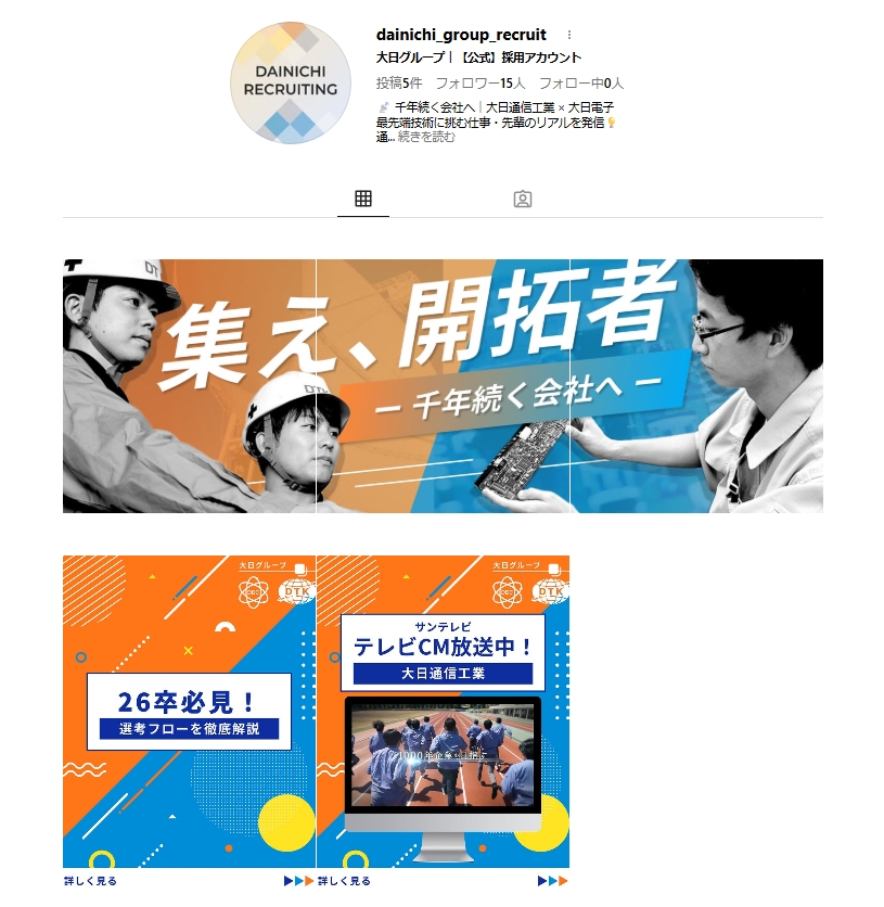 いざ 千年続く会社へ 時代のニーズに合わせて、時に実直に、時に大胆に 挑戦できる環境ならここにある これからの大日をつくるのは君だ 大日でしかできない挑戦を共に さぁ、集え開拓者 TOP MESSAGE MOVIE動画 サンテレビCM公開中 大日通信工業株式会社 大日通信工業株式会社 【お父さんの仕事編】30秒ver. 大日通信工業株式会社 【千年企業を目指す編】15秒ver. News & Topics新着情報 MORE 2025/09/12 大日グループ 公式Instagramを開設いたしました! 2025/09/10 国際フロンティア産業メッセ2025に出展いたしました! 2025/08/05 内定者ランチ会を開催しました! ABOUT大日グループを知る 数字とキーワードで見る大日グループ MORE 通信設備の施工から保守まで大日通信工業 電子機器や情報通信機器の製造大日電子 CROSS TALK座談会 大日電子 大日通信工業 INTERVIEW働く先輩の声 大日通信工業、大日電子、それぞれの環境で働く社員の声を集めました。 MORE 社会システム統括部 第一プラント建設部 O.Tさん 2014年入社 開発部 ソリューション開発課 Y.Rさん 2019年入社 電設部 Y.Yさん 2018年入社 第三事業部 製造部 製造一課 H.Kさん 2019年入社 社会システム統括部 第二プラント建設部 M.Mさん 2020年入社 製造部 実装課 Y.Tさん 2015年入社 第三事業部 製造部 品質管理課 S.Kさん 2020年入社 電設部 K.Aさん 2021年入社 製造管理部 生産革新G H.Kさん 2021年入社 MORE 人が育つから企業が育つ。 企業をつくるのは人です。その”人”が育たなければ企業の成長はありません。 だからこそ、大日グループは従業員ファースト。 「成長したい」という意欲ある従業員を全力でサポートします! もちろん、仕事の充実には家庭やプライベートも大切。 なので、福利厚生や家族へのフォロー体制も充実しています。 大日グループの仕事環境 採用担当者からのメッセージ就職活動中の皆さんへ MESSAGE 集え、開拓者 大日グループが目指すのは“千年続く会社” 千年続く会社になるために 現状維持を続けているだけではいけない。 時代に応じた成長をし続けなければ。 新しいことに挑戦する人間 それを私たちは開拓者と呼ぶ。 一緒に“千年続く会社”を作る開拓者を大日グループは求めている。 共に挑戦し 成長していこう さぁ 集え。大日流 開拓者 募集要項大日通信工業株式会社・大日電子株式会社の募集要項はこちら エントリー採用ご応募、求人に関するご質問、会社見学はこちら
